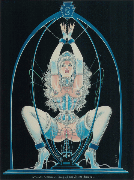 The sexy shaved secretary thinks it over for a minute… with her hands fettered to the bed like this, she can't put up much of a struggle. "I don't hear you, Alison…" snaps Fiona impatiently… "Do I have to whip your pussy?" "No, mistress… yes, mistress… I mean no mistress…" stammers the helpless blonde as she stretches out on her belly. Alison feels a cold swab on her softly trembling white buttock, then the jab of the needle and a slightly painful pressure as Fiona empties the syringe deep in her glutes. The familiar tingling warmth is soon spreading through her bloodstream again, up her spine to her brain making her feel sort of sleepily excited, docile and yet eager. Unconsciously she rubs her thighs together as she turns back over on the bed, awakening pleasant sensations in her stiffening little clit. This effect is not lost on Fiona, who puts aside the depleted hypo and reaches down with her rubber-gloved hand to toy with her captive's pink and hairless slit. "There… that's not so bad, is it?" "No, Mistress…" says Alison quietly through open and trembling lips, her eyes getting a misty and submissive look as her girlish little pussy starts moistening itself. The feel of the black rubber fingers on her smoothly-shaved mound is kind of weirdly exciting. She has totally forgotten about her half-baked plan to escape.