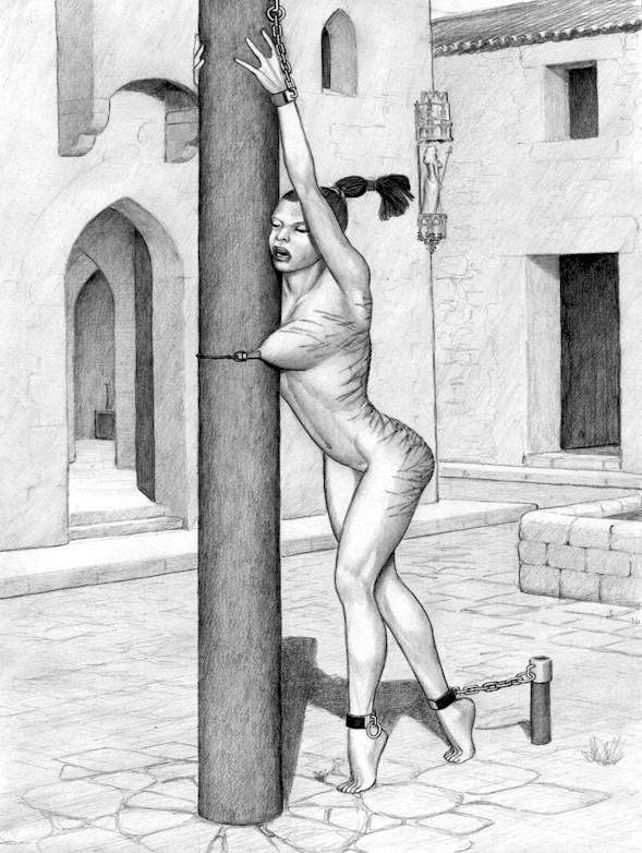 stretched either side of the post. She couldn't move or she'd lose her tits.