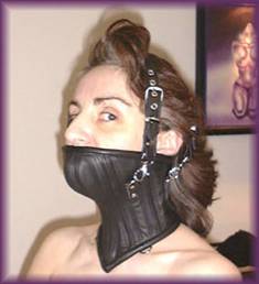 Per then pulled a white soft ball out of his pocket with a two webbing straps hanging from it, and held it in front of Dor ' s mouth. She gulped and opened her mouth wide , and Per forced it in and fastened it tight around her cheeks and at the back of her head. He then picked up the posture collar and swung it round Dor ' s neck and lower face, knowing what to expect, she tilted her head back to 45 degrees and the collar moulded under her chin, Per then joined the two sides at the back with a zip and covered the zip with a velcro strap, leaving just the rear lacing. The collar had two sets of boning, one set, heavy tight packed boning around the neck which forced Dor ' s head back , and in between lighter more flexible boning which flowed up, under and around Dor ' s chin and up to just under her nose. Once past the jaw the heavier boning continued in the mask until to mid way up her ears and even higher at the back. When he was happy with the fit, he held it up with two webbing starps over the top of her head and laced it tight until the mask was stiff and perfectly smooth over Dor ' s face and neck.