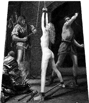 The Ergastulum An Ergastulum was a private prison attached to most ancient Roman farms where the slaves were made to work in chains. It was usually underground with the only light stemming from narrow slits that were too high from the ground to permit escape. The slaves confined in an ergastulum were forced by day to cultivate the fields in chains. Slaves who had displeased their masters were punished by imprisonment in the ergastulum and subjected to terrible tortures. Slaves were often skinned alive. Others were drained of blood, decapitated, or bound tightly, suspended painfully and whipped to appease lustful citizens under the pretext of the desires of the Roman gods. A trustworthy slave had custody of the ergastulum, and was thus called ergastularius. These prisons came about in consequence of the conquest of Italy by the Romans, and the great number of barbarous slaves who were needed to cultivate the conquered lands and create a base of wealth for the Roman citizenry. This tale is an account of three Greek sisters who were subjected to great abuse in the depths of an ergastulum. Having just arrived as a captive from a punitive raid on the Greek isle of Rhodes, Adara's naked body was held down over a tall, sturdy wooden trestle table. Ankles apart, bound with thick cord to the inverted V formed by the legs of the trestle; her slight body was stretched out horizontally. Lying along the filthy, wet wooden surface, head turned to one side at its far end, she dreaded what was about to happen. Her hands were roughly pulled down to the bottom of the legs at the far end of the table and tied tight to metal rings in the legs. "The matter that has concerned me lately," Master Galus had told his ergastularius, "...has been these stories about slaves coming from these Greek territories. A useless lazy lot that needs to be taught Roman discipline. I want them broken fully at the farm before I consider them for personal duty." With these directions in mind, Kaeso, the ergastularius, clutched the handle of a leather flagellum in his right hand and cracked it sharply through the air. Then, positioned properly behind Andara, he carefully took the end of the whip in his left hand, pulling the lashes taught, and drew his arm back high in the air above shoulder height. Quickly, he snapped the whip down delivering the straps straight across the girl's backside, coloring them with red lines tracing her pale buttocks. She gave a scream followed by a quick intake of breath. Kaeso stepped back, pausing, and waited for the pain to reach its peak, giving time for the shock of the first blow to give way to dread anticipation of the next, then lifted the whip high again and drove it down for a second time. This second more intense blow cut the flesh as the tips of the whip wrapped around Andara's ribs. "AAAAAAARGH!" "SILENCE!" Kaeso ordered. "You will take your discipline properly." Kaeso's words were followed immediately by a third vicious blow to Andara's buttocks that deepened the ever-reddening rump and bringing forth a yelp. Kaeso repositioned himself to properly deliver a fourth blow that landed perpendicular to the girl' body, tracing lines downwards from the bottom of her back to the top of her left thigh. Shifting again, Kaeso struck hard again on the back bringing forward an anguished sob. Kaeso paused a bit and contemplated his victim. He thought that actually, considering her circumstances-the trauma of capture, exhaustion from the long voyage with little to eat-this Greek woman was enduring the flogging rather well. With that, the ergastularius drew another leather flogger that had been soaking nearby in a bucket of brine. This flagellum many straps were heavily knotted at their ends. He raised the dripping straps and dealt a sixth almighty blow. Andara bucked furiously writhing with the pain that peaked at an unimaginable level expertly complimented by the salty liquid. Suddenly, amid her sobs, Andara felt herself being untied and pulled to her feet then immediately turned around. Her back was now along the horizontal top of the trestle, and through her teary eyes she stared at the ceiling. Her hands were pulled backwards, behind her head, and secured to the trestle legs and a cord was thrown round her waist and tied off below to cinch her belly. While Andara labored for breath resticted by her position and bindings, Kaeso then moved to her legs, bound each ankle to the top of the trestle legs at the near end of the table, baring her most intimate parts. Kaeso then took hold of the now drying whip and administered severe punishment to her breasts. Multiple blows rained down on Andara's small glands. The huge leather knots pummled her nipples. Andara's whole body writhed in absolute agony, but the ropes held her tight as Kaeso continued to whip her with increasing strength across her most intimate areas. The lashes to her inner thighs and pubic area brought Andara to hysterics. Abruptly the torment ceased. "You'll receive 40 more lashes wench," Kaeso calmly commented. "You needn't be concerned about a sickness coming from the wounds as you'll be purified with salt afterwards." True to his word, following the beating, Kaeso rubbed course sea salt into the Andara's broken skin while allowing Andara to freely scream. Watching from nearby were Andara's two older sisters. They were suspended from the ceiling of the dimly lit, stuffy ergastulum. They two were naked and hung from rough-hewn posts that were tied to the backs of their shoulders. Their arms were pulled to the rear and passed over the posts with their wrists tied to their ankles that were drawn up and behind. The oldest of the siblings, Eris, was but in her late 25th year but had already born five children. While her body still was nubile, her breasts were heavily milk laden after having given birth just prior to her capture. The other younger sister, Keres hung next to Eris. She had witnessed Andara's punishment with a bit of a gleeful dem