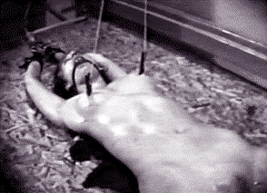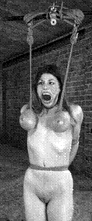 Keres suspended when Simban arrives. "Stupid, stubborn, stinking Greek," Simban bellowed. "You've withstood punishment for a month, you have proved your mettle-now surrender!" Keres only stared straight ahead. Letting Keres's head drop, Simban called for Gylo. "My patience is gone Greek. No more simply wearing you down. Gylo, get this bitch down and hang her by her teats. When she is crazed with the pain, then rack her on her back on the floor. Get water down her-copious amounts until her belly swells--then clamp her rings to the ceiling chains and rip them from her teats! Make her feel it Gylo-take your time." Gylo did as ordered. He unfastened Keres from the timber holding her aloft and rebound her so she stood vertically. He then coiled ropes around her breasts and pulled her up on her toes. Within minutes the terrible pain seared into her chest and Keres wailed deeply. When he was sure the agony was at its peak, before numbness set in, Gylo cut the suffering girl free and she collapsed on the floor. Quickly gathering the ropes, Gylo attached her wrists and ankles to rings on the floor and racked her tight. He dropped the timber formerly holding her aloft and attached it by chain to her nipple rings.