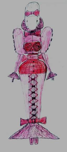 Pinky pushed off, wincing and staggered back to the table, gasping for air again. When she had calmed, she picked up the jacket. It had taken her weeks to make and still she had needed help from a retired seamstress down the road. It was in pink satin, with pink trim. It was a short bolero reaching to just over the top of the corset, with a cut out to allow the cone bra to thrust through, it would have had a loose 2” stand up collar, which would now be tight over the rigid neck corset. It had massive puff sleeves that were stiffly padded; these narrowed down to the elbow where the sleeves became incredibly tight and were fastened by closely packed loop buttons, at the end of the sleeves was a froth of pink lace which would stand out from the wrist like the skirt flounce. The front, above and below the cutout was closed by the same buttons. Following the theme of the skirt , the padded sleeves which stuck out 4” upwards sideward and forwards were decorated with pink bows, starting small at the elbow and getting larger at the widest part of the padded shoulders. The hidden features of the jacket were that it had been cut short across the back so that, Pinky would have to pull her shoulders way back to get it on, also the inners of the puff sleeves were sewn to the bodice of the jacket so that she would be unable to raise her elbows and as with the skirt there was 2” of padding from under the arms downwards to make her waist look smaller.