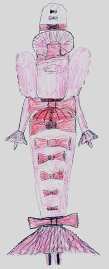 Pinky looked in the mirror and saw her reflection, she was totally appalled. She looked completely tacky. The two flounces along with bows made her look like a heavily wrapped pink toffee. The whole pink outfit with the flounces and the bows made her look like Barbara Cartland on acid. What would people think when they saw her.