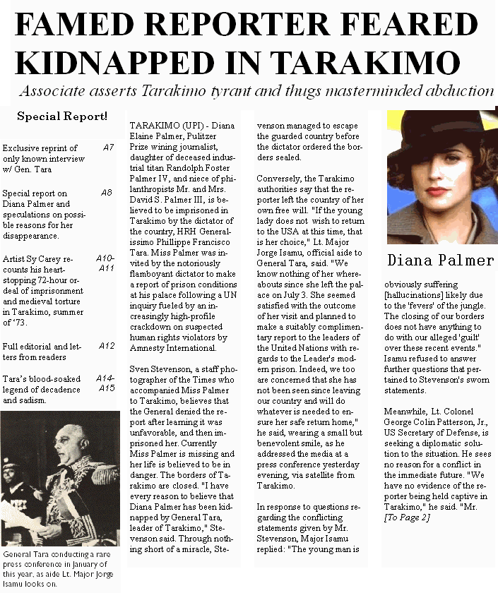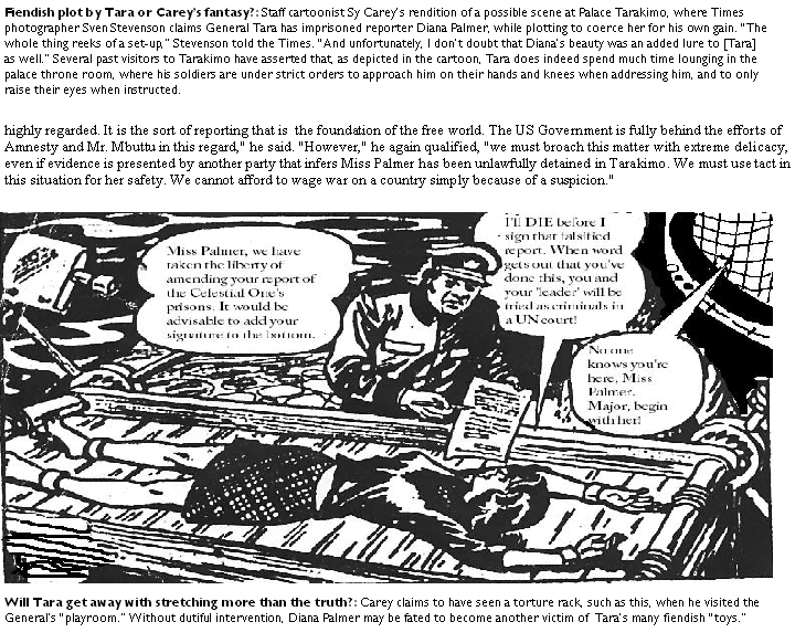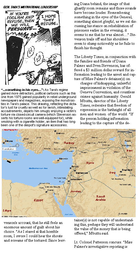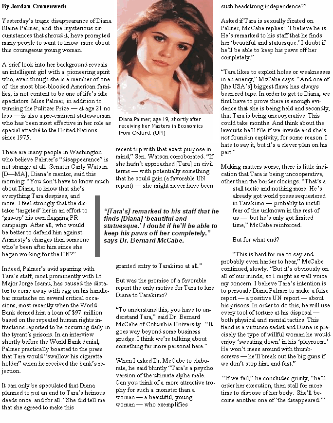 Diana Palmer, crusading female journalist and human rights advocate, runs afoul of evil dictator General Tara, while attempting to expose his human rights violations to the world. In addition to using Diana as a PR tool to lighten his world image, however, the dictator has other plans. What follows is a battle of wills and temptations that threaten to turn Diana from a crusading do-gooder into a willing sex-toy for the use and disposal of the villainous tyrant. Will Diana be saved? Will she want to be saved? Read on, and find out.