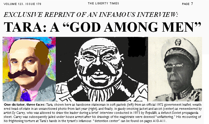 As the dictator's thugs descended upon her, they displayed the front of the mask --- a ghoulish replica of her face, pristinely made-up with funeral parlor precision and wearing a mouth shaped into a semi-erotic “O” --- as it stared back at her with intense, but dull eyes. It was placed over her once more.