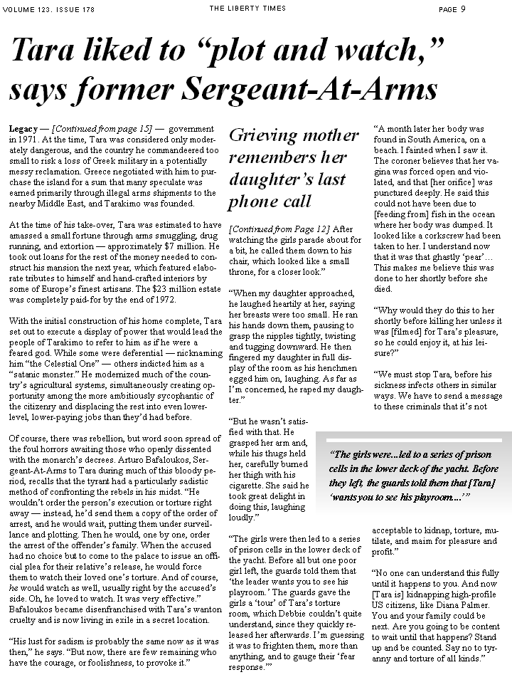 “Yes, they are Tarakimo's,” Patterson said softly, before continuing. “What I was referring to is your daughter's recent sighting just outside of Athens . My men are looking into it.”