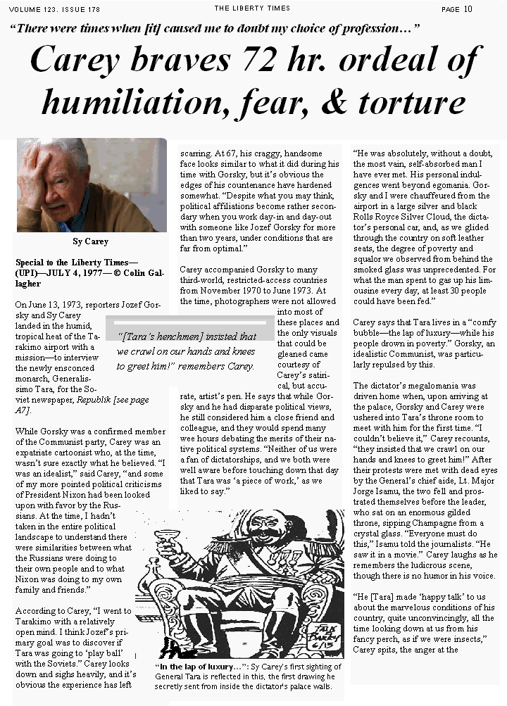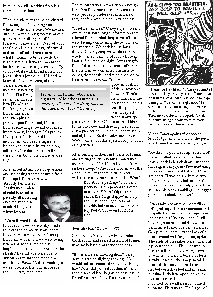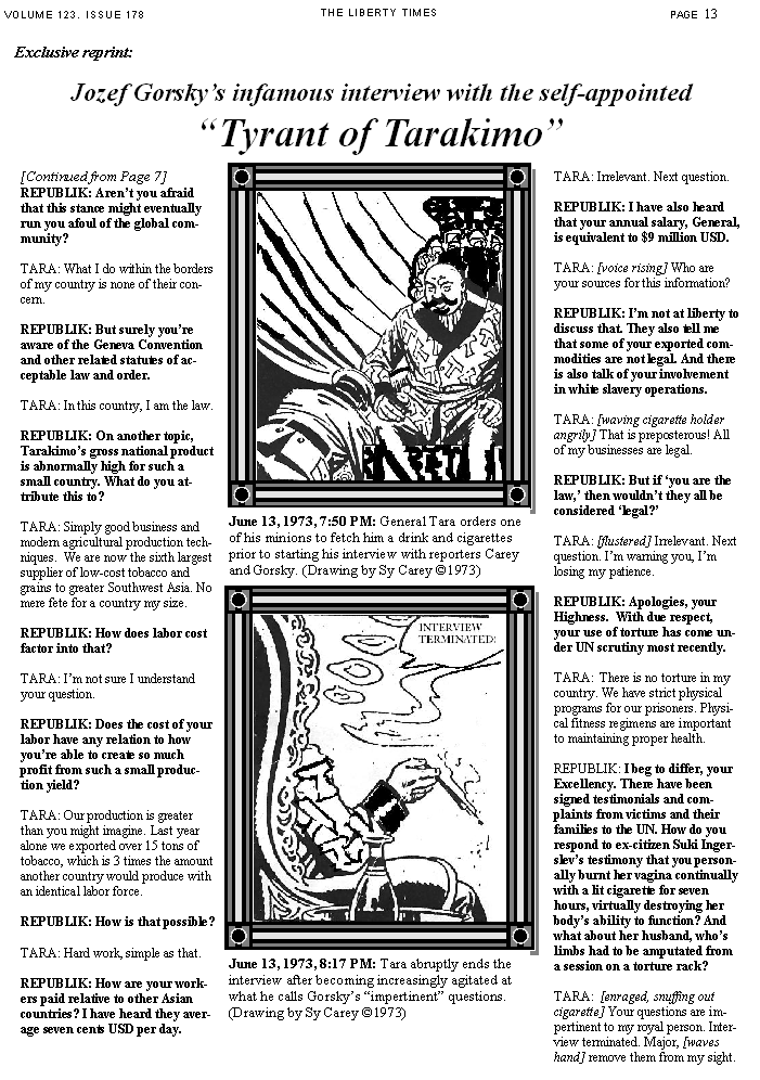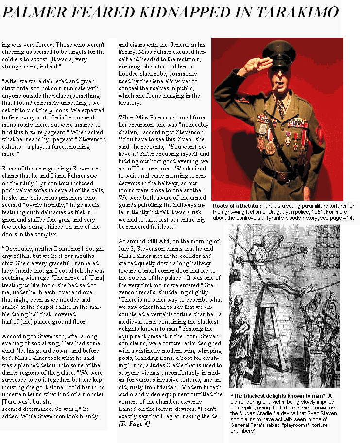 “Mr. Palmer,” Sven said, giving him a tight smile, before continuing. “I arrived at Tarakimo airport on July 5 to find Isamu and his henchmen there at the terminal, barring me from leaving the country. They had bayonets, for Christ's sake! They pulled no punches. Without a full retraction, my wife and daughter would have been kidnapped and tortured, and most likely I would not be here today.”