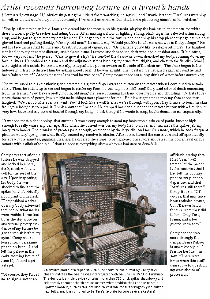 “Logical?” Palmer sputtered, “What's logical about any of this? Look, you have sworn testimony from dozens of people about how dangerous this man is. People have seen instruments of torture being used in the same prison where Diana is being held!”
