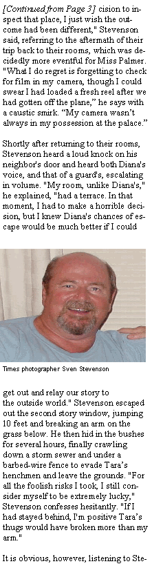 “So, your story is still that Tara 's thugs threatened you after you made your initial press statements while still in Tarakimo. Is that right, Mr. Stevenson?” Palmer asked, ignoring Sven's extraneous questions with cold neutrality.